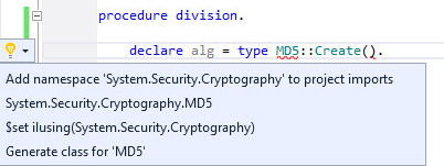 If the IDE does not have information about a type, it displays a pop-up message with an error message COBCH0845 and a few suggestions about how to fix it. Use this quick action to add a $set ilusing statement at the start of your program that imports the namespace.