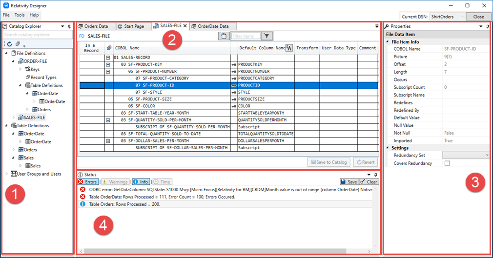 This pane displays detailed information on elements of the catalog, such as individual data items and table definitions.