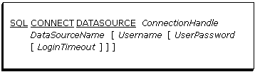 The SQL CONNECT DATASOURCE statement establishes a connection to a named data source. A user name and user password may be supplied for data sources with security constraints. A login timeout value may also be specified.