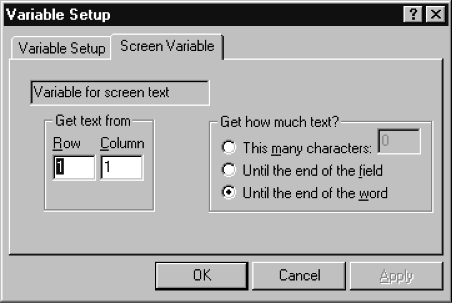 This gets 3 characters from the screen at row 1, column 78 and saves them as a variable that your macro can use.