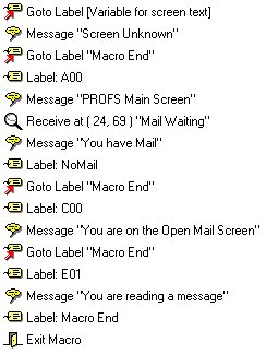 This macro looks at the current PROFS screen and returns a message box containing a description of what was found. You can use this macro as a model to test different macro functions.
