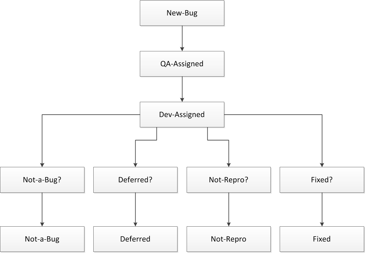 次に示す例は、独自のワークフローに組み込む状態のサンプルです。新しいバグが入ってくると、組織内のだれかが、レビューのためにそのバグを適切な QA エンジニアにディスパッチします。QA エンジニアが報告された動作が新しいバグであることに同意すると、バグは修正のために開発部門に送られます。開発部門では、バグに対していくつかのアクションを実施できます。