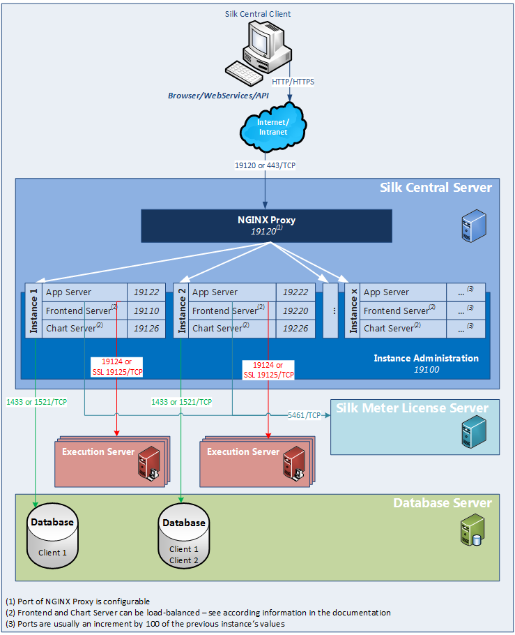プロキシ サービスは Silk Central サーバー上にインストールされ、さまざまなインスタンスへのアクセスを制御します。各インスタンスのサービスは、専用のポートで実行していますが、セキュリティと柔軟性向上のため、http://<Silk Central サーバー>:19120/<インスタンス名> 形式のアクセスを、プロキシがインスタンス名から実際の URL にルーティングします。